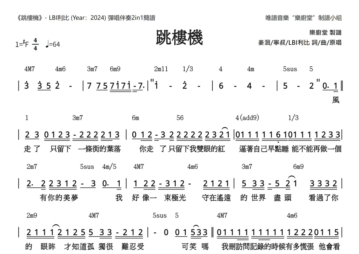 《跳楼机》是lbi利比演唱的一首歌曲,和弦简谱,拍号为4/4拍,歌曲速度为每分钟64拍,这份简谱共有两张高清图谱,图谱由 @唯谱音乐"乐厨堂"发布小组 编配上传。