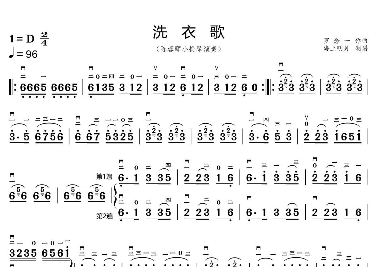 《洗衣歌》是陈蓉晖演奏版演唱的一首歌曲,简谱,拍号为2/4拍,歌曲速度为每分钟96拍,这份小提琴谱共有两张高清图谱,图谱由 @海上明月 编配上传。