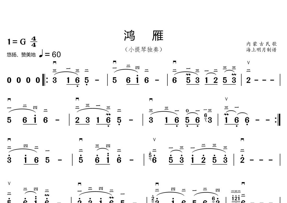 《鸿雁》是内蒙古民歌演唱的一首歌曲,简谱,拍号为4/4拍,歌曲速度为每分钟60拍,这份小提琴谱共有一张高清图谱,图谱由 @海上明月 编配上传。