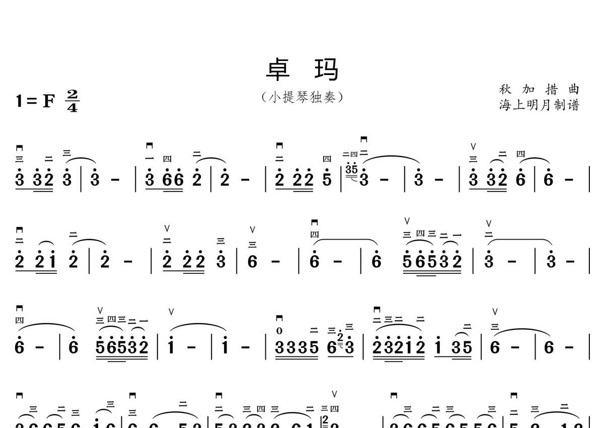 《卓玛》是小提琴简谱演唱的一首歌曲,拍号为2/4拍,这份小提琴谱共有两张高清图谱,图谱由 @海上明月 编配上传。