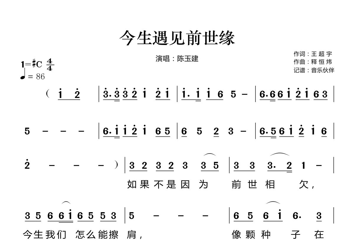 《今生遇见前世缘》是陈玉建演唱的一首歌曲,拍号为4/4拍,歌曲速度为每分钟86拍,这份简谱共有两张高清图谱,图谱由 @音乐伙伴 编配上传。