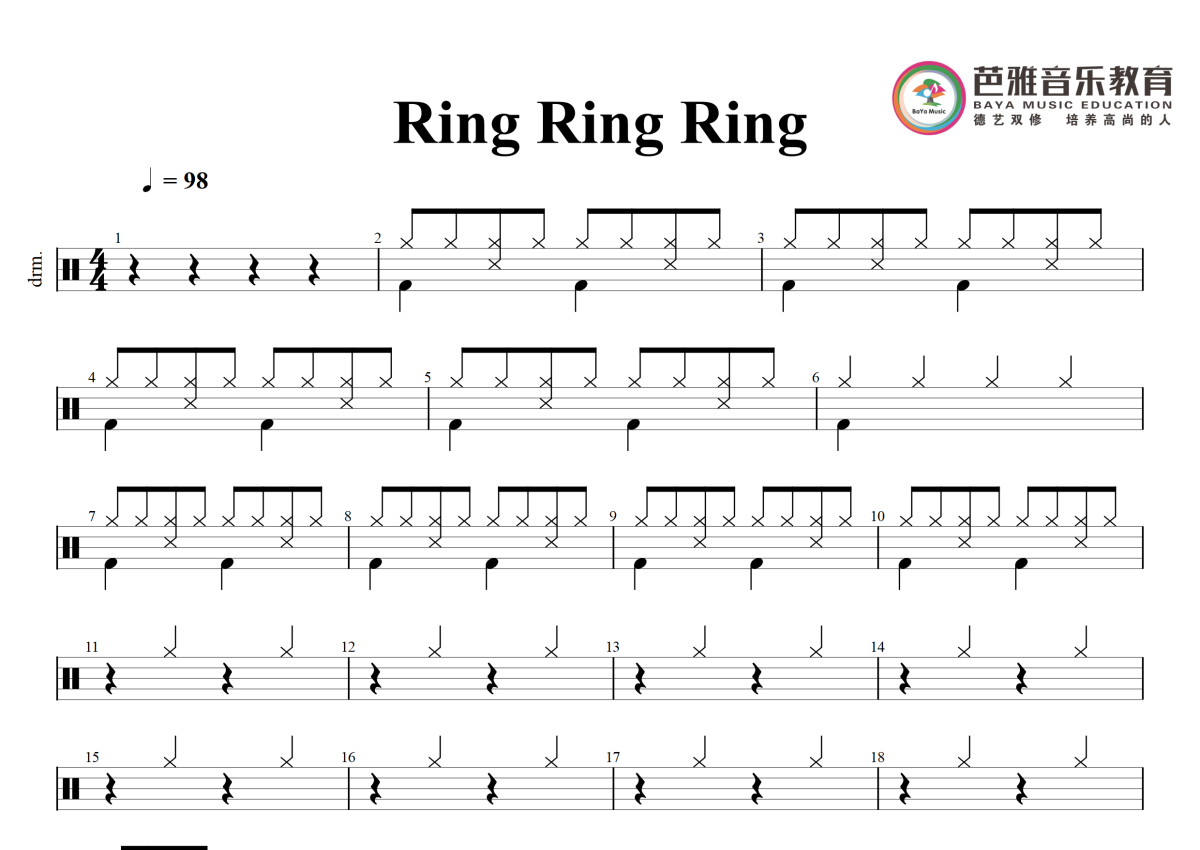 《Ring Ring Ring》是小野来了演唱的一首歌曲,拍号为4/4拍,歌曲速度为每分钟98拍,这份架子鼓谱共有一张高清图谱,图谱由 @擂鼓者 编配上传,图谱使用五线谱编配,使用这份Ring Ring Ring架子鼓谱,你将能够轻松地敲打出这首小野来了的Ring Ring Ring,快来尝试吧。