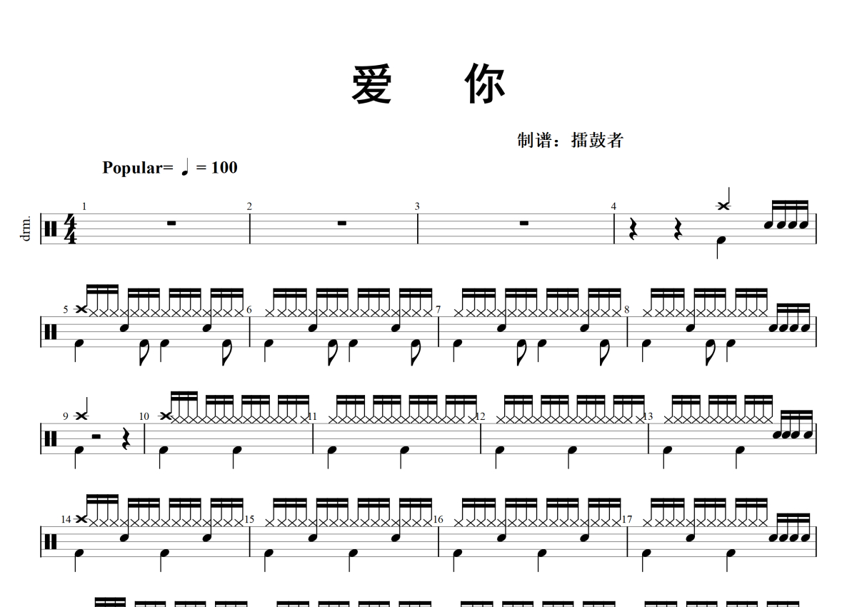 《爱你》是王心凌演唱的一首歌曲,拍号为4/4拍,歌曲速度为每分钟100拍,这份架子鼓谱共有两张高清图谱,图谱由 @擂鼓者 编配上传,图谱使用五线谱编配,使用这份爱你架子鼓谱,你将能够轻松地敲打出这首王心凌的爱你,快来尝试吧。