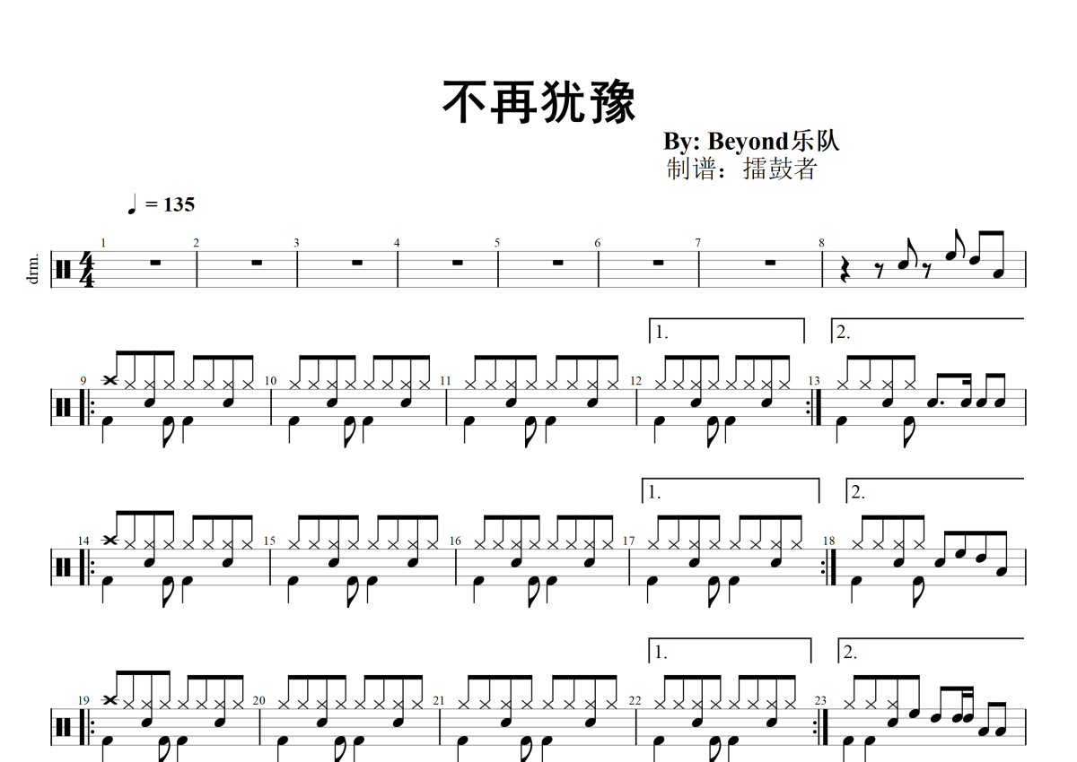 《不再犹豫》是Beyond乐队演唱的一首歌曲,拍号为4/4拍,歌曲速度为每分钟135拍,这份架子鼓谱共有两张高清图谱,图谱由 @擂鼓者 编配上传,图谱使用五线谱编配,使用这份不再犹豫架子鼓谱,你将能够轻松地敲打出这首Beyond乐队的不再犹豫,快来尝试吧。