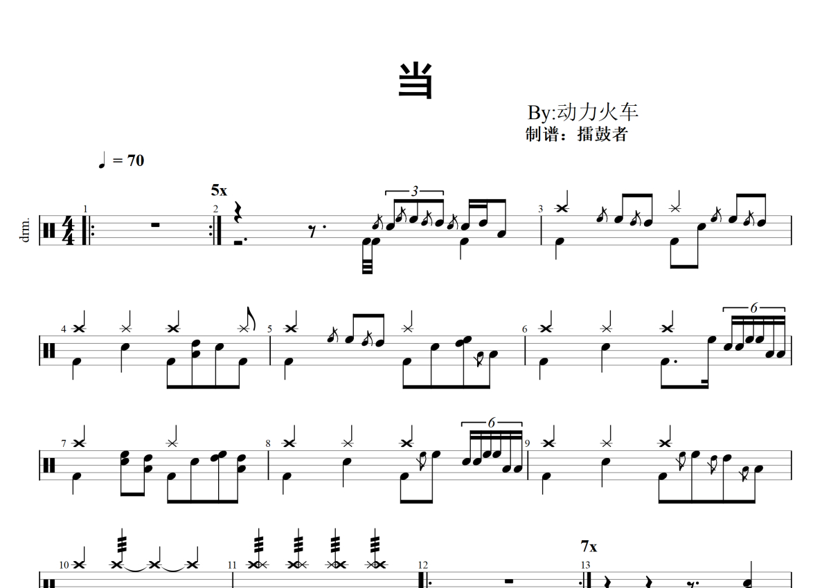 《当》是动力火车演唱的一首歌曲,拍号为4/4拍,歌曲速度为每分钟70拍,这份架子鼓谱共有三张高清图谱,图谱由 @擂鼓者 编配上传,图谱使用五线谱编配,使用这份当架子鼓谱,你将能够轻松地敲打出这首动力火车的当,快来尝试吧。