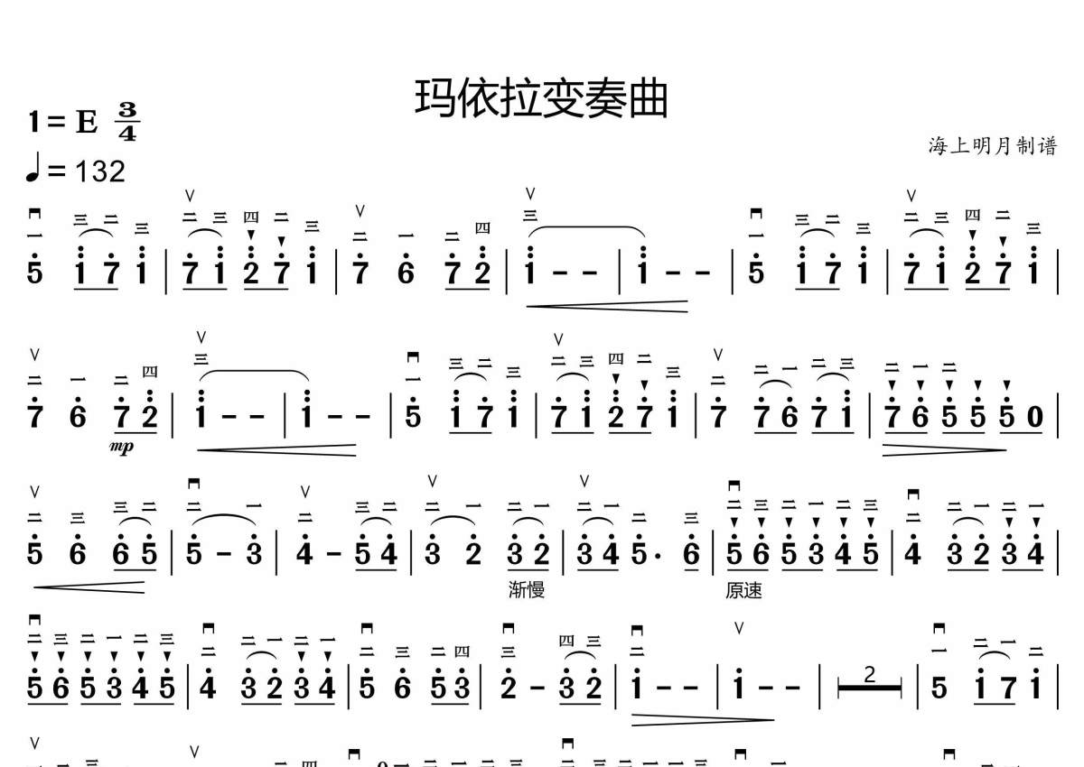 《玛依拉变奏曲》是小提琴简谱演唱的一首歌曲,拍号为3/4拍,这份小提琴谱共有一张高清图谱,图谱由 @海上明月 编配上传。