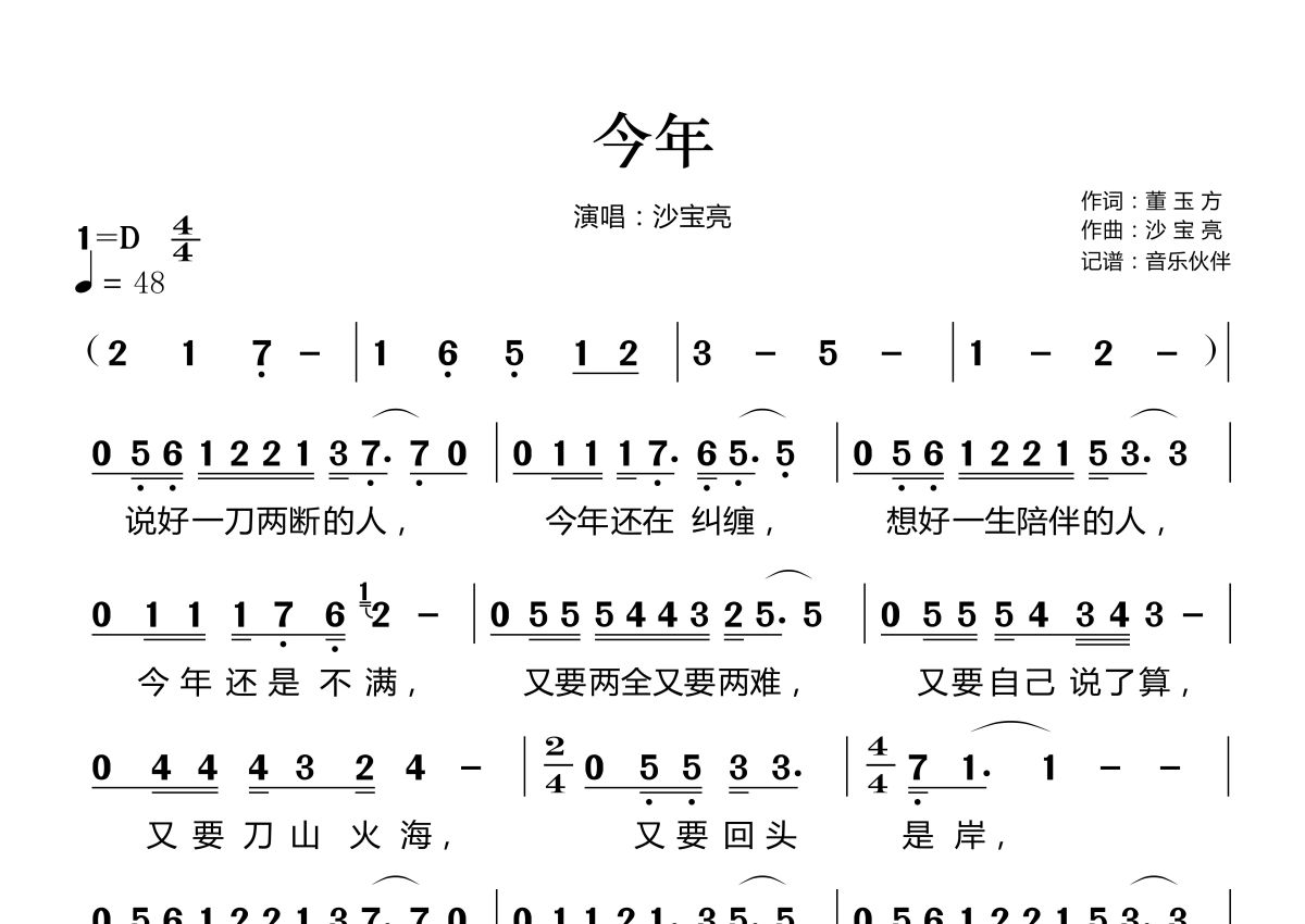 《今年》是沙宝亮演唱的一首歌曲,拍号为4/4拍,歌曲速度为每分钟48拍,这份简谱共有两张高清图谱,图谱由 @音乐伙伴 编配上传。