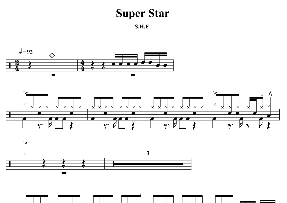 《Super Star》是SHE演唱的一首歌曲,拍号为4/4拍,歌曲速度为每分钟92拍,这份架子鼓谱共有三张高清图谱,图谱由 @音符喷血者 编配上传,图谱使用五线谱编配,使用这份Super Star架子鼓谱,你将能够轻松地敲打出这首SHE的Super Star,快来尝试吧。