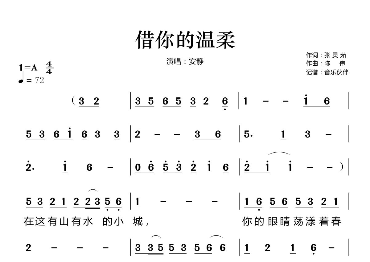 《借你的温柔》是安静演唱的一首歌曲,拍号为4/4拍,歌曲速度为每分钟72拍,这份简谱共有两张高清图谱,图谱由 @音乐伙伴 编配上传。