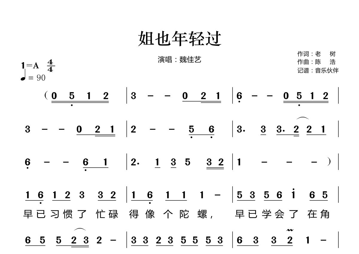 《姐也年轻过》是魏佳艺演唱的一首歌曲,拍号为4/4拍,歌曲速度为每分钟90拍,这份简谱共有两张高清图谱,图谱由 @音乐伙伴 编配上传。