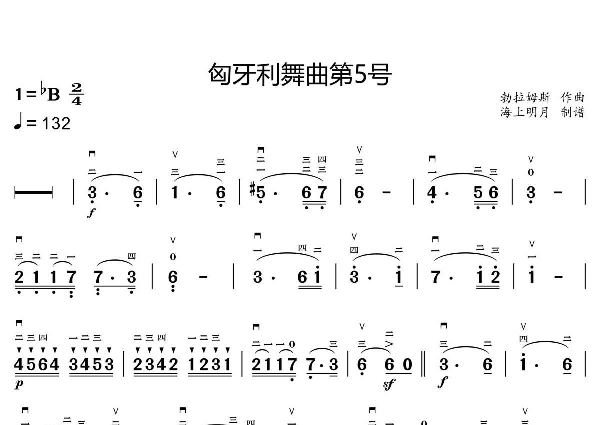 《匈牙利舞曲第5号》是勃拉姆斯演唱的一首歌曲,简谱版,这份小提琴谱共有两张高清图谱,图谱由 @海上明月 编配上传。