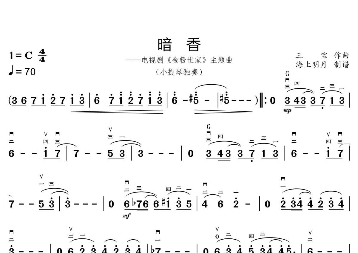 《暗香》是三宝演唱的一首歌曲,简谱版,这份小提琴谱共有一张高清图谱,图谱由 @海上明月 编配上传。