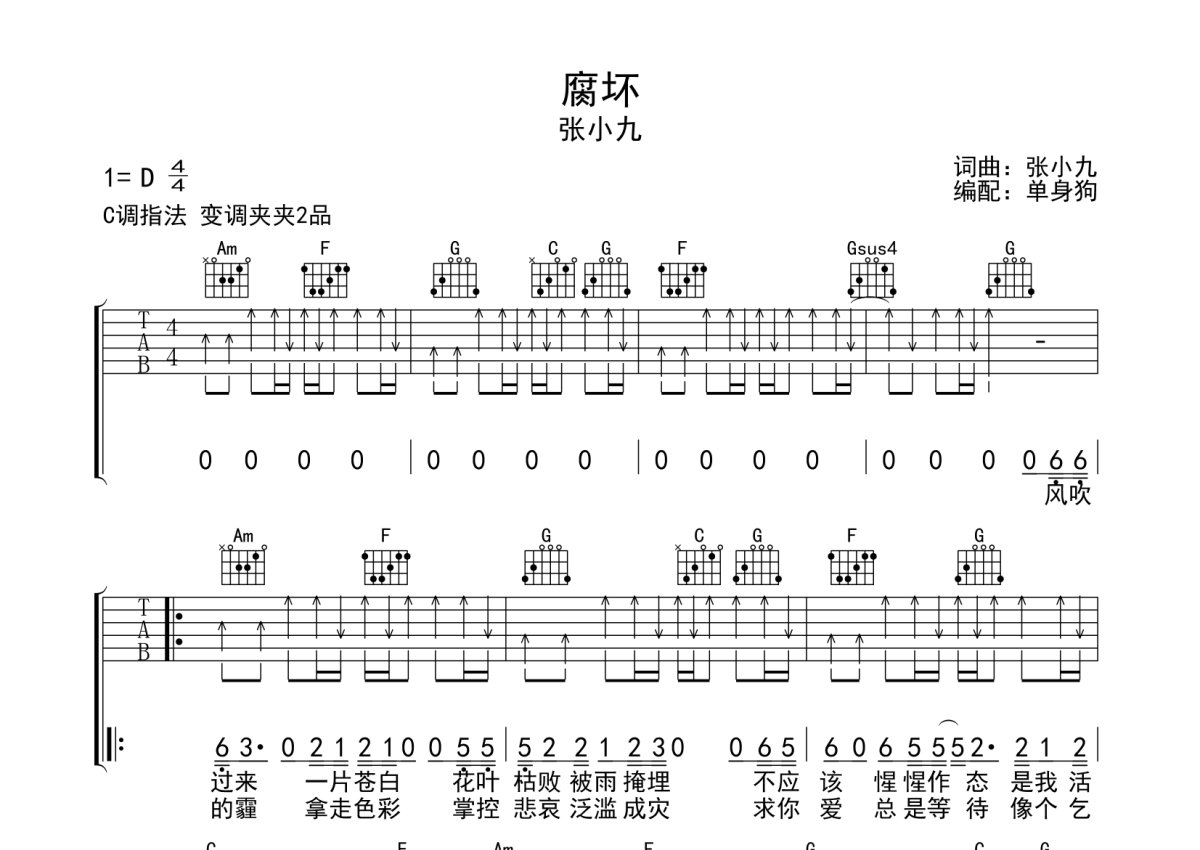 张小九《腐坏》吉他谱 - C调弹唱六线谱