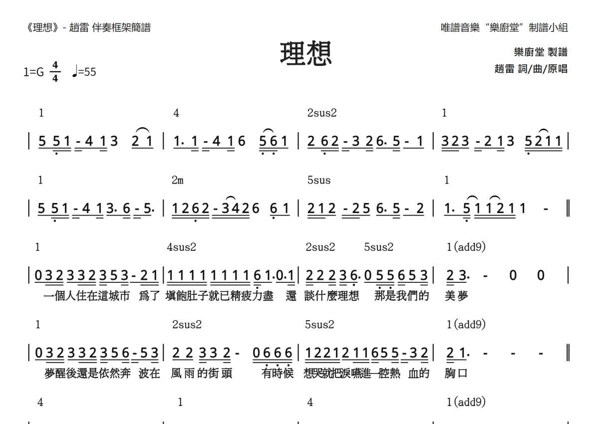 《理想》是赵雷演唱的一首歌曲,和弦简谱,拍号为4/4拍,歌曲速度为每分钟55拍,这份简谱共有两张高清图谱,图谱由 @唯谱音乐"乐厨堂"发布小组 编配上传。