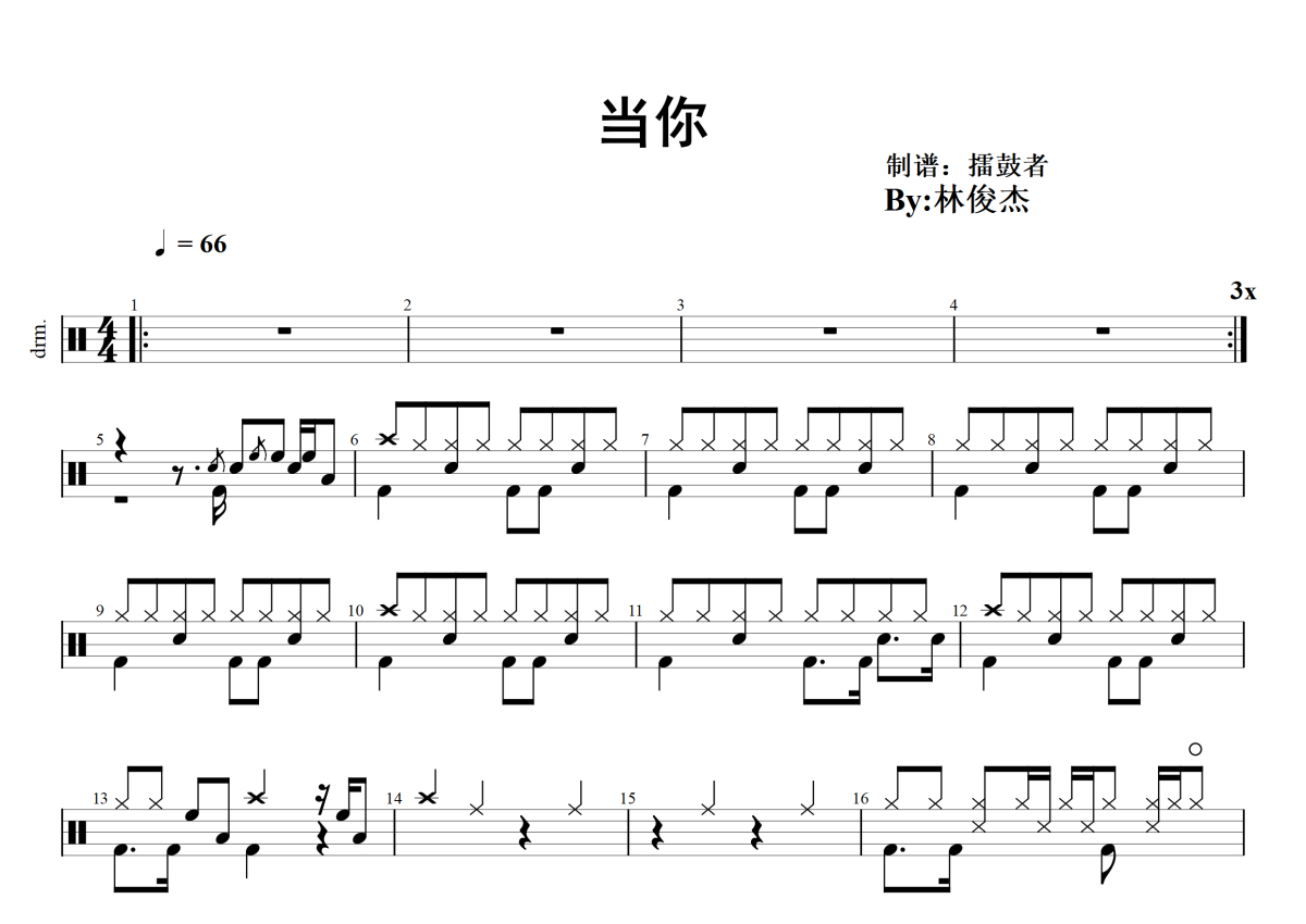 《当你》是林俊杰演唱的一首歌曲,拍号为4/4拍,歌曲速度为每分钟66拍,这份架子鼓谱共有两张高清图谱,图谱由 @擂鼓者 编配上传,图谱使用五线谱编配,使用这份当你架子鼓谱,你将能够轻松地敲打出这首林俊杰的当你,快来尝试吧。