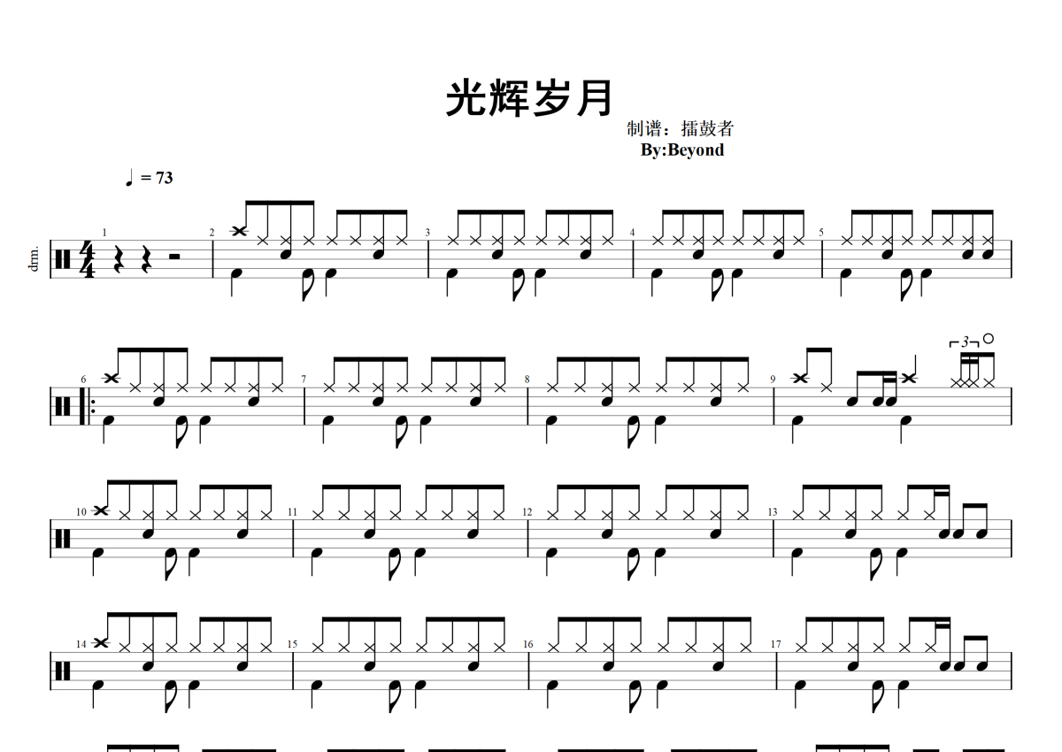 《光辉岁月》是Beyond演唱的一首歌曲,拍号为4/4拍,歌曲速度为每分钟73拍,这份架子鼓谱共有两张高清图谱,图谱由 @擂鼓者 编配上传,图谱使用五线谱编配,使用这份光辉岁月架子鼓谱,你将能够轻松地敲打出这首Beyond的光辉岁月,快来尝试吧。