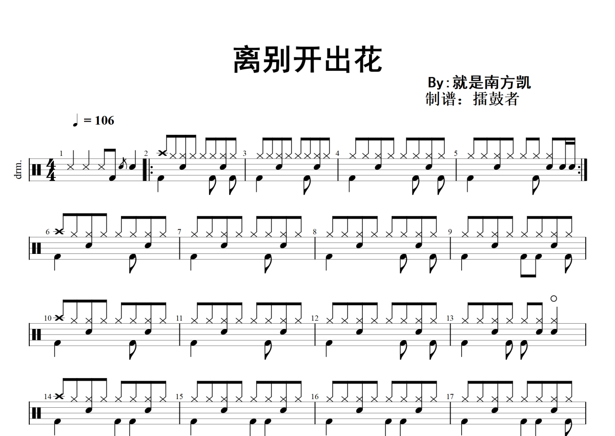《离别开出花》是就是南方凯演唱的一首歌曲,拍号为4/4拍,歌曲速度为每分钟106拍,这份架子鼓谱共有两张高清图谱,图谱由 @擂鼓者 编配上传,图谱使用五线谱编配,使用这份离别开出花架子鼓谱,你将能够轻松地敲打出这首就是南方凯的离别开出花,快来尝试吧。
