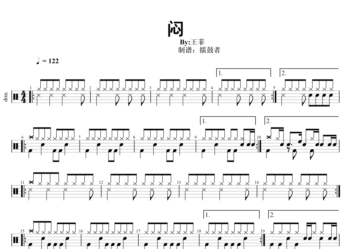 《闷》是王菲演唱的一首歌曲,拍号为4/4拍,歌曲速度为每分钟122拍,这份架子鼓谱共有两张高清图谱,图谱由 @擂鼓者 编配上传,图谱使用五线谱编配,使用这份闷架子鼓谱,你将能够轻松地敲打出这首王菲的闷,快来尝试吧。