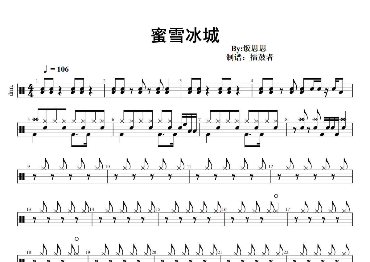 《蜜雪冰城》是饭思思演唱的一首歌曲,拍号为4/4拍,歌曲速度为每分钟106拍,这份架子鼓谱共有两张高清图谱,图谱由 @擂鼓者 编配上传,图谱使用五线谱编配,使用这份蜜雪冰城架子鼓谱,你将能够轻松地敲打出这首饭思思的蜜雪冰城,快来尝试吧。