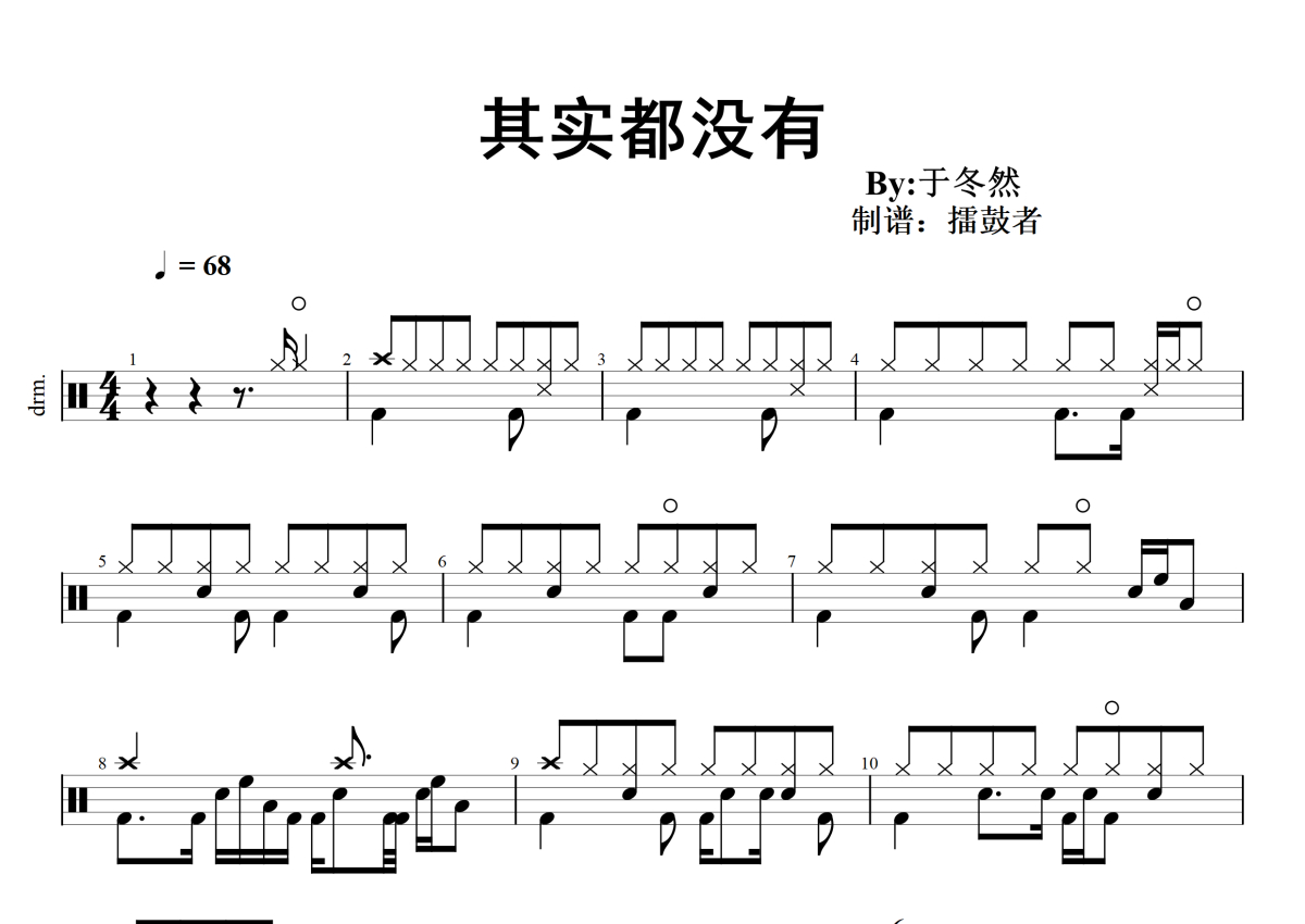 《其实都没有》是于冬然演唱的一首歌曲,拍号为4/4拍,歌曲速度为每分钟68拍,这份架子鼓谱共有两张高清图谱,图谱由 @擂鼓者 编配上传,图谱使用五线谱编配,使用这份其实都没有架子鼓谱,你将能够轻松地敲打出这首于冬然的其实都没有,快来尝试吧。