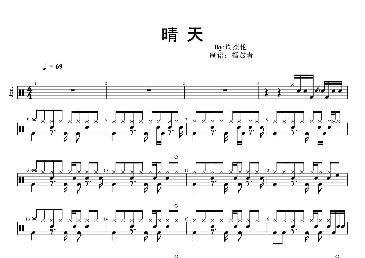 《晴天》是周杰伦演唱的一首歌曲,拍号为4/4拍,歌曲速度为每分钟69拍,这份架子鼓谱共有两张高清图谱,图谱由 @擂鼓者 编配上传,图谱使用五线谱编配,使用这份晴天架子鼓谱,你将能够轻松地敲打出这首周杰伦的晴天,快来尝试吧。