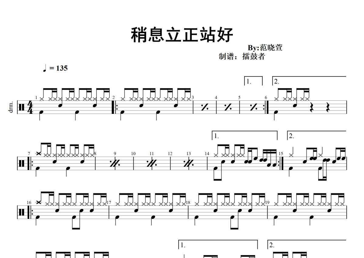 《稍息立正站好》是范晓萱演唱的一首歌曲,拍号为4/4拍,歌曲速度为每分钟135拍,这份架子鼓谱共有两张高清图谱,图谱由 @擂鼓者 编配上传,图谱使用五线谱编配,使用这份稍息立正站好架子鼓谱,你将能够轻松地敲打出这首范晓萱的稍息立正站好,快来尝试吧。