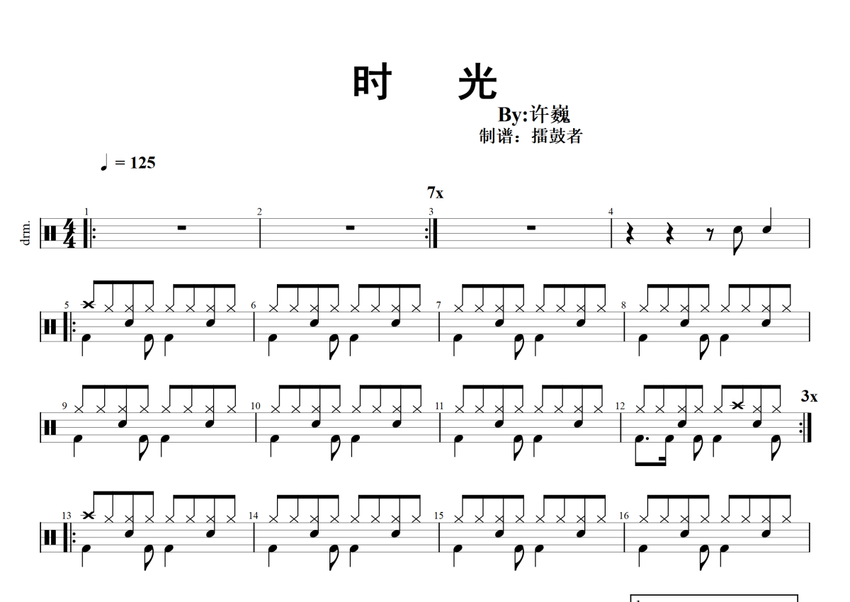 《时光》是许巍演唱的一首歌曲,拍号为4/4拍,歌曲速度为每分钟125拍,这份架子鼓谱共有两张高清图谱,图谱由 @擂鼓者 编配上传,图谱使用五线谱编配,使用这份时光架子鼓谱,你将能够轻松地敲打出这首许巍的时光,快来尝试吧。