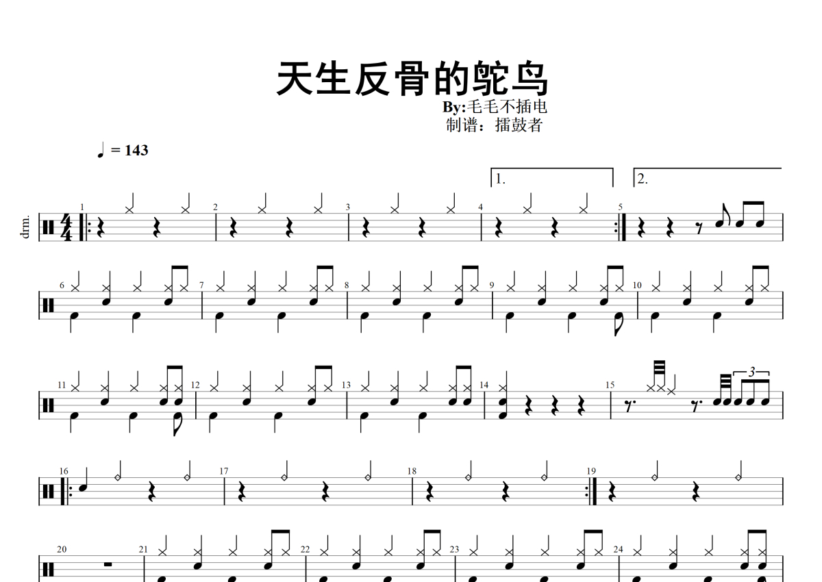 《天生反骨的鸵鸟》是毛毛不插电演唱的一首歌曲,拍号为4/4拍,歌曲速度为每分钟143拍,这份架子鼓谱共有两张高清图谱,图谱由 @擂鼓者 编配上传,图谱使用五线谱编配,使用这份天生反骨的鸵鸟架子鼓谱,你将能够轻松地敲打出这首毛毛不插电的天生反骨的鸵鸟,快来尝试吧。