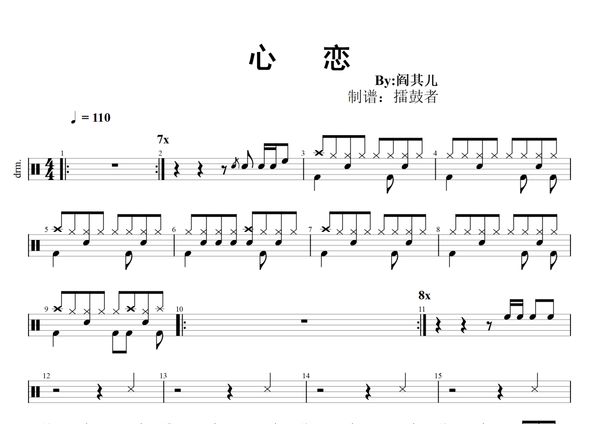 《心恋》是阎其儿演唱的一首歌曲,拍号为4/4拍,歌曲速度为每分钟110拍,这份架子鼓谱共有两张高清图谱,图谱由 @擂鼓者 编配上传,图谱使用五线谱编配,使用这份心恋架子鼓谱,你将能够轻松地敲打出这首阎其儿的心恋,快来尝试吧。