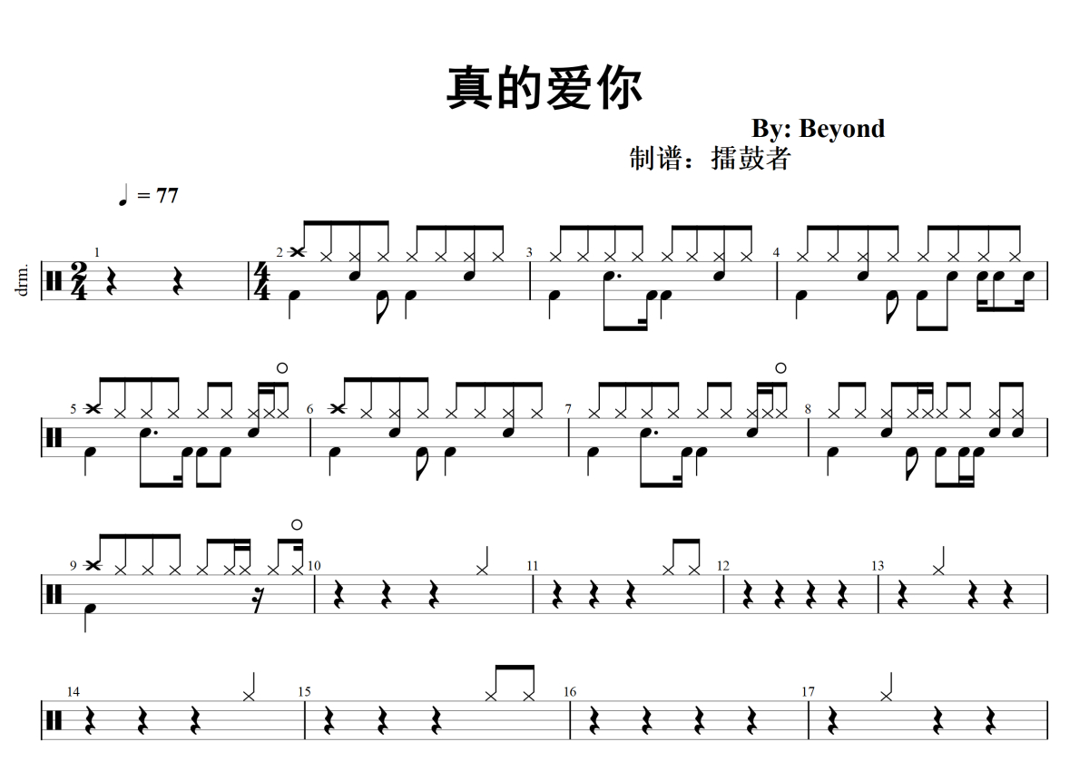 《真的爱你》是BEYOND演唱的一首歌曲,拍号为2/4拍,歌曲速度为每分钟77拍,这份架子鼓谱共有三张高清图谱,图谱由 @擂鼓者 编配上传,图谱使用五线谱编配,使用这份真的爱你架子鼓谱,你将能够轻松地敲打出这首BEYOND的真的爱你,快来尝试吧。
