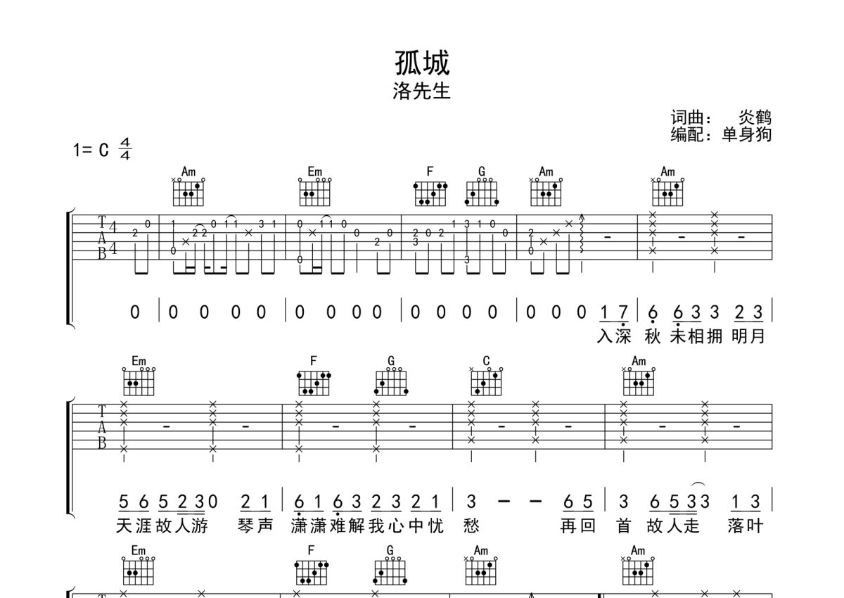 洛先生《孤城》吉他谱 - C调弹唱六线谱