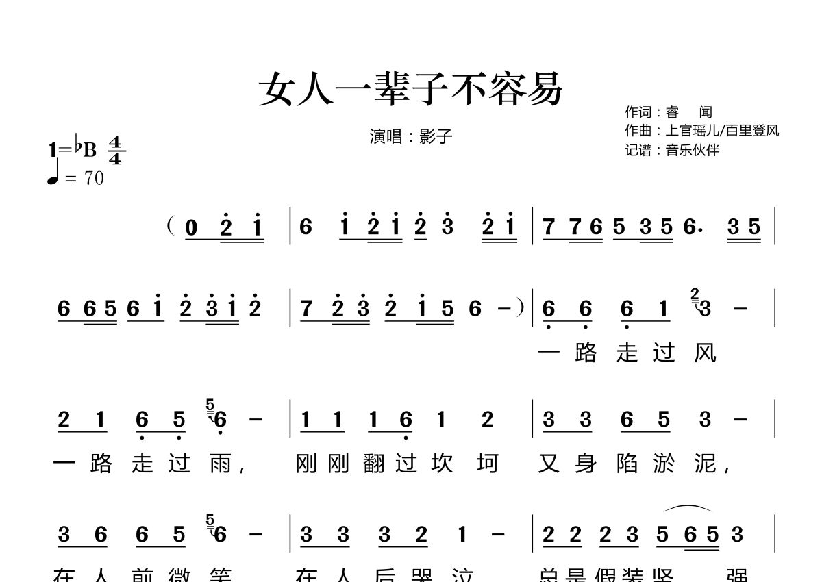 《女人一辈子不容易》是影子演唱的一首歌曲,拍号为4/4拍,歌曲速度为每分钟70拍,这份简谱共有两张高清图谱,图谱由 @音乐伙伴 编配上传。