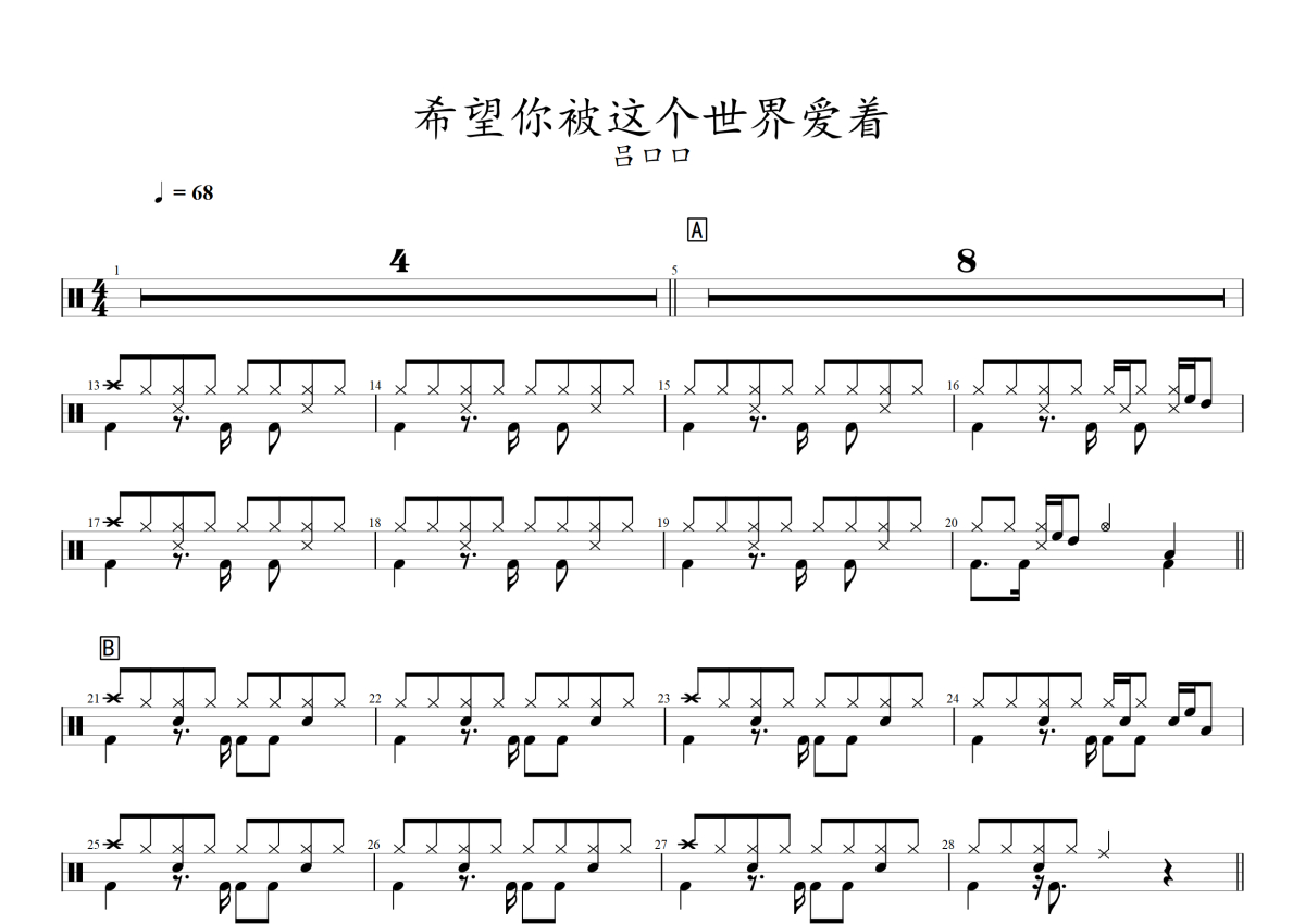 《希望你被这个世界爱着》是吕口口演唱的一首歌曲,拍号为4/4拍,歌曲速度为每分钟68拍,这份架子鼓谱共有两张高清图谱,图谱由 @音符喷血者 编配上传,图谱使用五线谱编配,使用这份希望你被这个世界爱着架子鼓谱,你将能够轻松地敲打出这首吕口口的希望你被这个世界爱着,快来尝试吧。