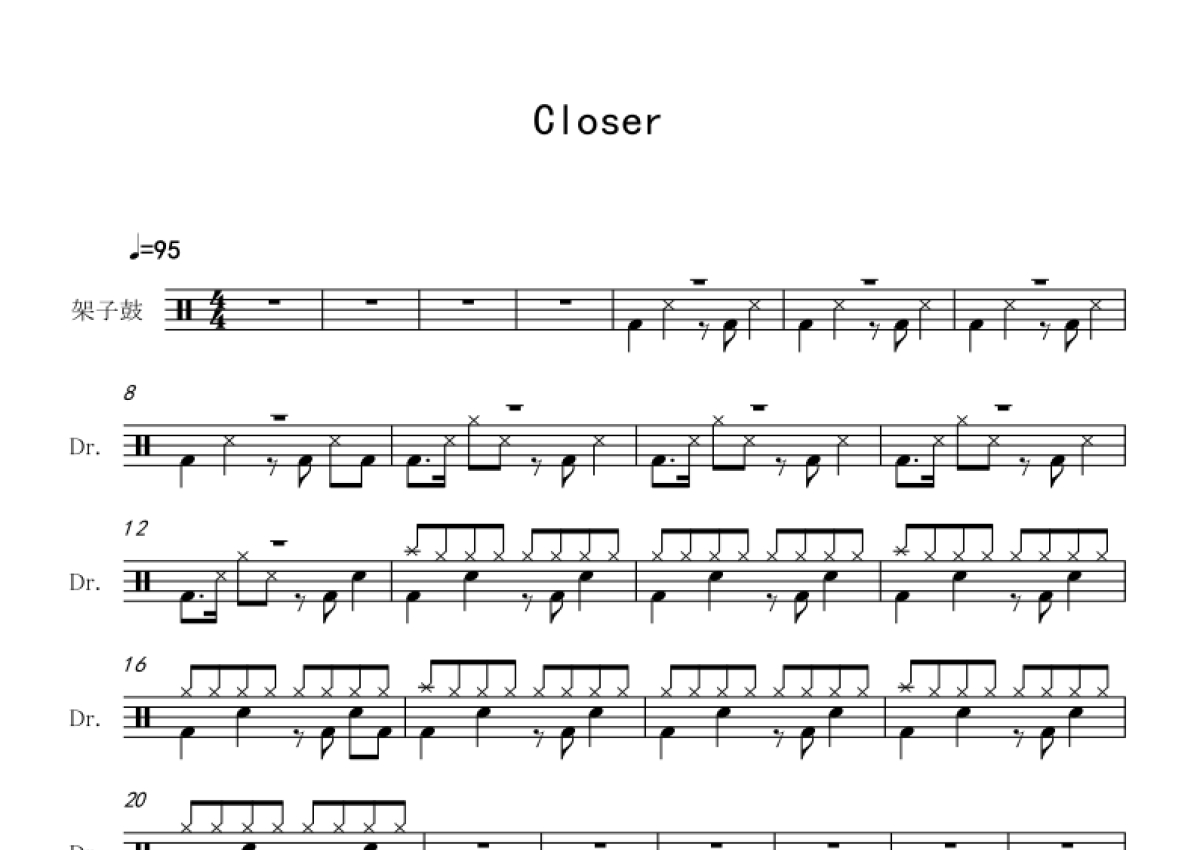 《Closer》是The Chainsmokers演唱的一首歌曲,拍号为4/4拍,歌曲速度为每分钟95拍,这份架子鼓谱共有两张高清图谱,图谱由 @音符喷血者 编配上传,图谱使用五线谱编配,使用这份Closer架子鼓谱,你将能够轻松地敲打出这首The Chainsmokers的Closer,快来尝试吧。