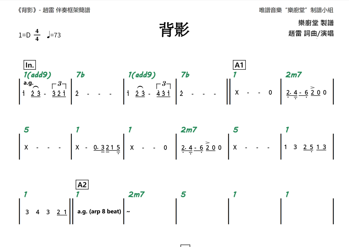 “乐厨堂”乐谱发布小组: 出版级乐谱扒谱制谱——以职业乐手圈通行标准记谱,遵循原版和声、伴奏元素和段落结构。 ❶ 2.0多功能专业团谱:采用台湾卓著公司开创的二代简谱标准制作。二代简谱无疑是迄今为止最科学、最易读的专业范畴多功能记谱方案:❷ 框架谱:采用职业乐手通常记谱方案制作。