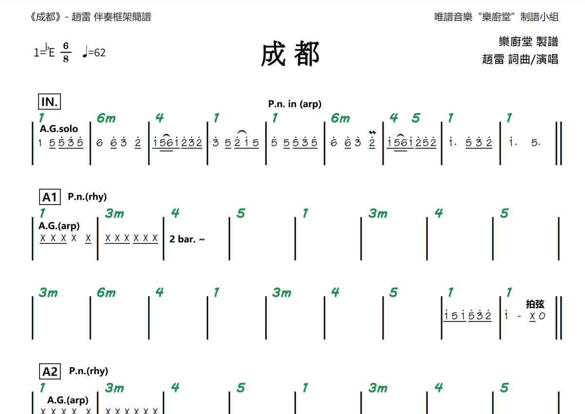 “乐厨堂”乐谱发布小组: 出版级乐谱扒谱制谱——以职业乐手圈通行标准记谱,遵循原版和声、伴奏元素和段落结构。 ❶ 2.0多功能专业团谱:采用台湾卓著公司开创的二代简谱标准制作。二代简谱无疑是迄今为止最科学、最易读的专业范畴多功能记谱方案:❷ 框架谱:采用职业乐手通常记谱方案制作。