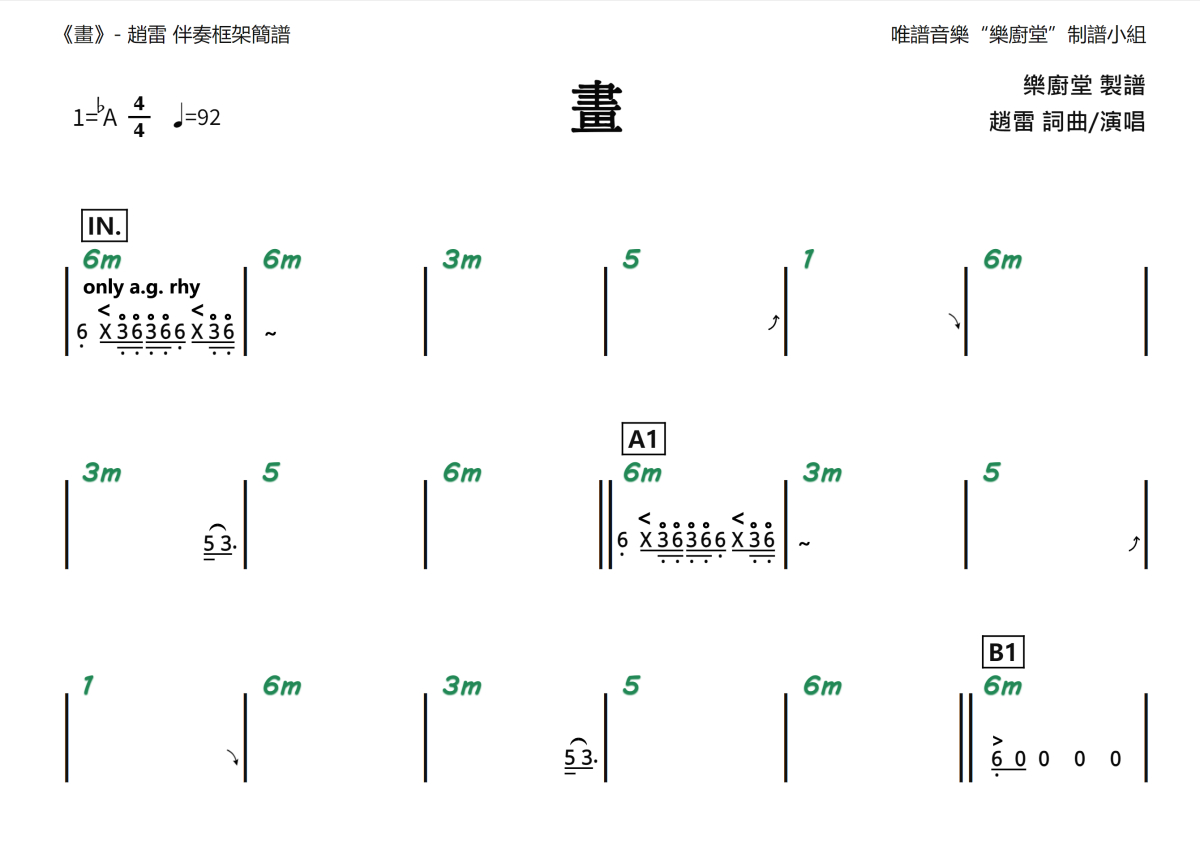 “乐厨堂”乐谱发布小组: 出版级乐谱扒谱制谱——以职业乐手圈通行标准记谱,遵循原版和声、伴奏元素和段落结构。 ❶ 2.0多功能专业团谱:采用台湾卓著公司开创的二代简谱标准制作。二代简谱无疑是迄今为止最科学、最易读的专业范畴多功能记谱方案:❷ 框架谱:采用职业乐手通常记谱方案制作。