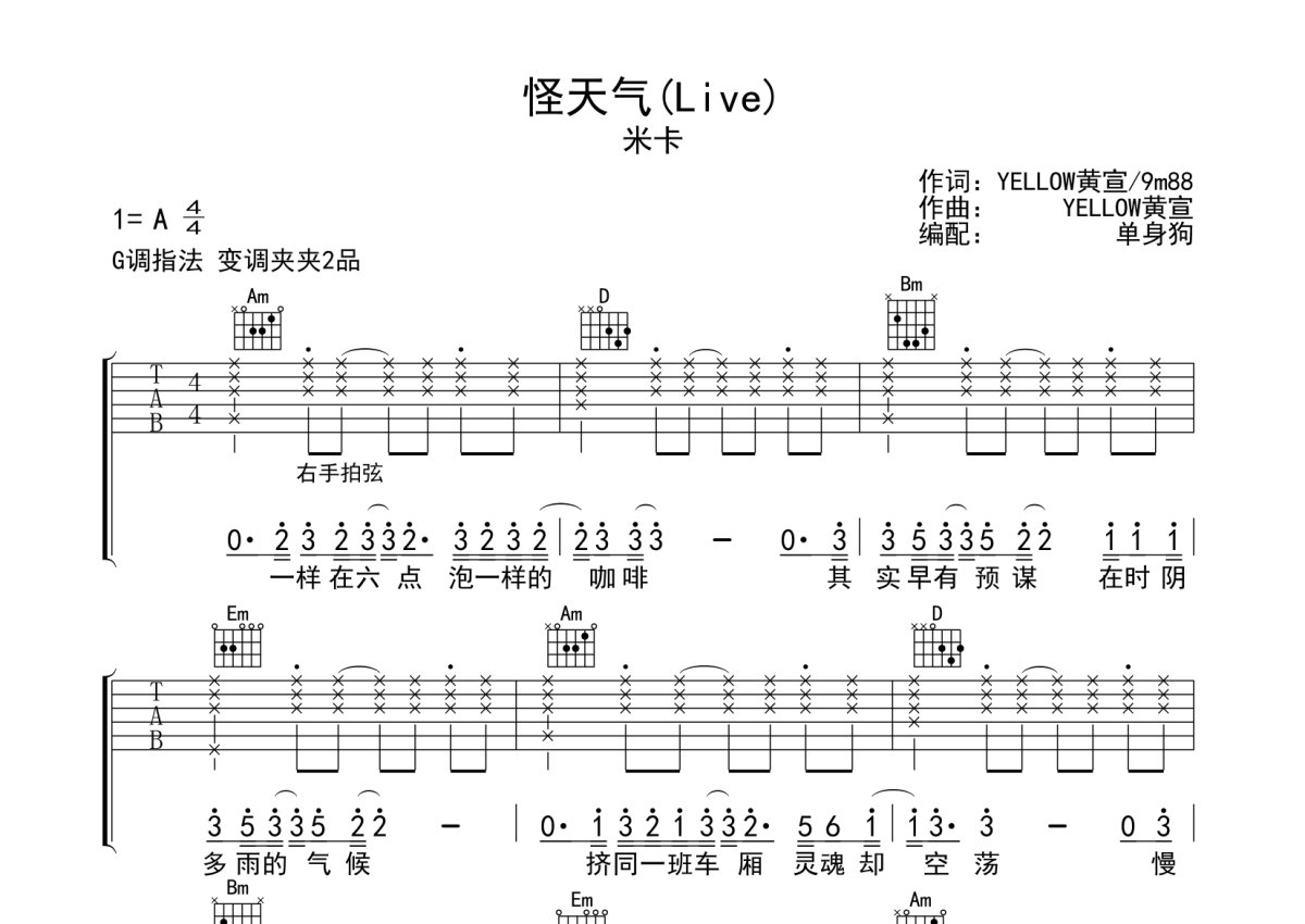 《怪天气》是米卡演唱的一首歌曲,Live,本吉他谱采用的是G调指法编配,这份吉他谱共有两张高清图谱,图谱由 @单身狗 编配上传,图谱使用六线谱编配,包含吉他和弦指法、简谱以及歌词部分,使用这份怪天气吉他谱,可以让你更加方便地掌握这首歌曲的弹唱技巧,快来尝试吧。米卡《怪天气(Live)》吉他弹唱谱,采用G调指法编配,单身狗编配出品,共有2张高清图谱,免翻页排版设计。