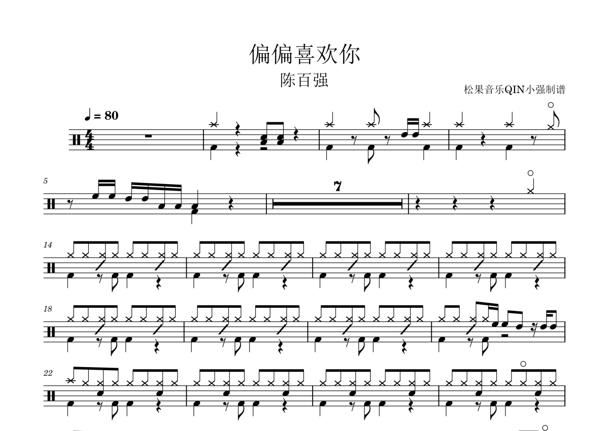 《偏偏喜欢你》是陈百强演唱的一首歌曲,拍号为4/4拍,这份架子鼓谱共有两张高清图谱,图谱由 @松果音乐QIN小强 编配上传,图谱使用五线谱编配,使用这份偏偏喜欢你架子鼓谱,你将能够轻松地敲打出这首陈百强的偏偏喜欢你,快来尝试吧。《偏偏喜欢你》是陈百强演唱的粤语流行歌曲,由郑国江作词,陈百强作曲,周启生编曲,收录在陈百强于1983年8月1日通过华纳唱片发行的同名专辑《偏偏喜欢你》中。2015年,电影《港囧》选用该曲作为插曲。