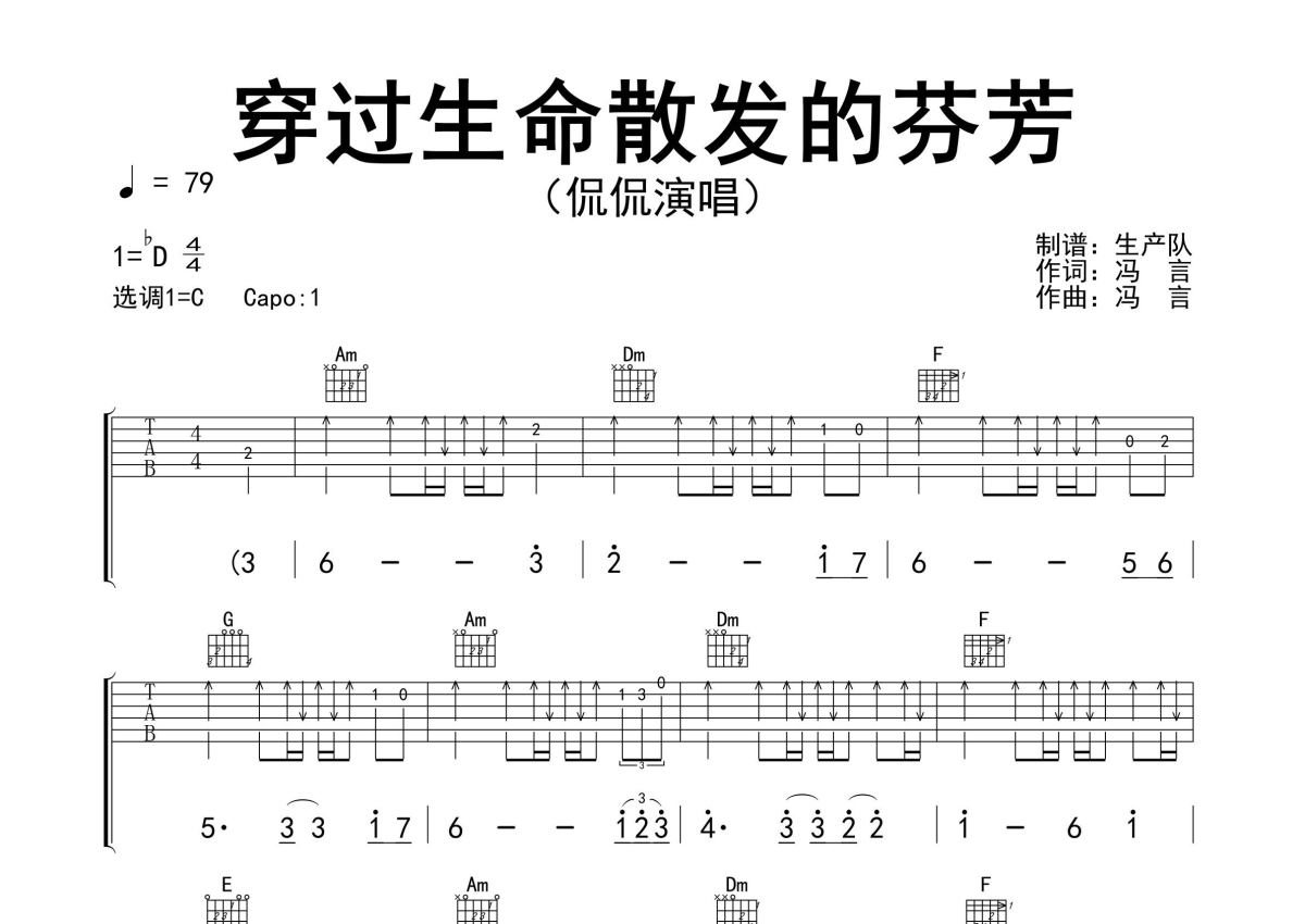 《穿过生命散发的芬芳》是侃侃演唱的一首歌曲,精编完美版,拍号为4/4拍,歌曲速度为每分钟79拍,歌曲原调为Db调,但由于原调指法比较难,为了方便弹奏,本吉他谱采用的是C调指法编配,变调夹1品弹奏即为原调,当然也可以根据自己的音域改变变调夹位置,或者通过改变和弦调性,以方便自己弹奏,这份吉他谱共有三张高清图谱,图谱由 @生产队 编配上传,图谱使用六线谱编配,包含吉他和弦指法、简谱以及歌词部分,使用这份穿过生命散发的芬芳吉他谱,可以让你更加方便地掌握这首歌曲的弹唱技巧,快来尝试吧。侃侃演唱的歌曲《穿过生命散发的芬芳》原版吉他谱,精准的前奏、间奏solo编配,精编完美版,怀旧经典!。