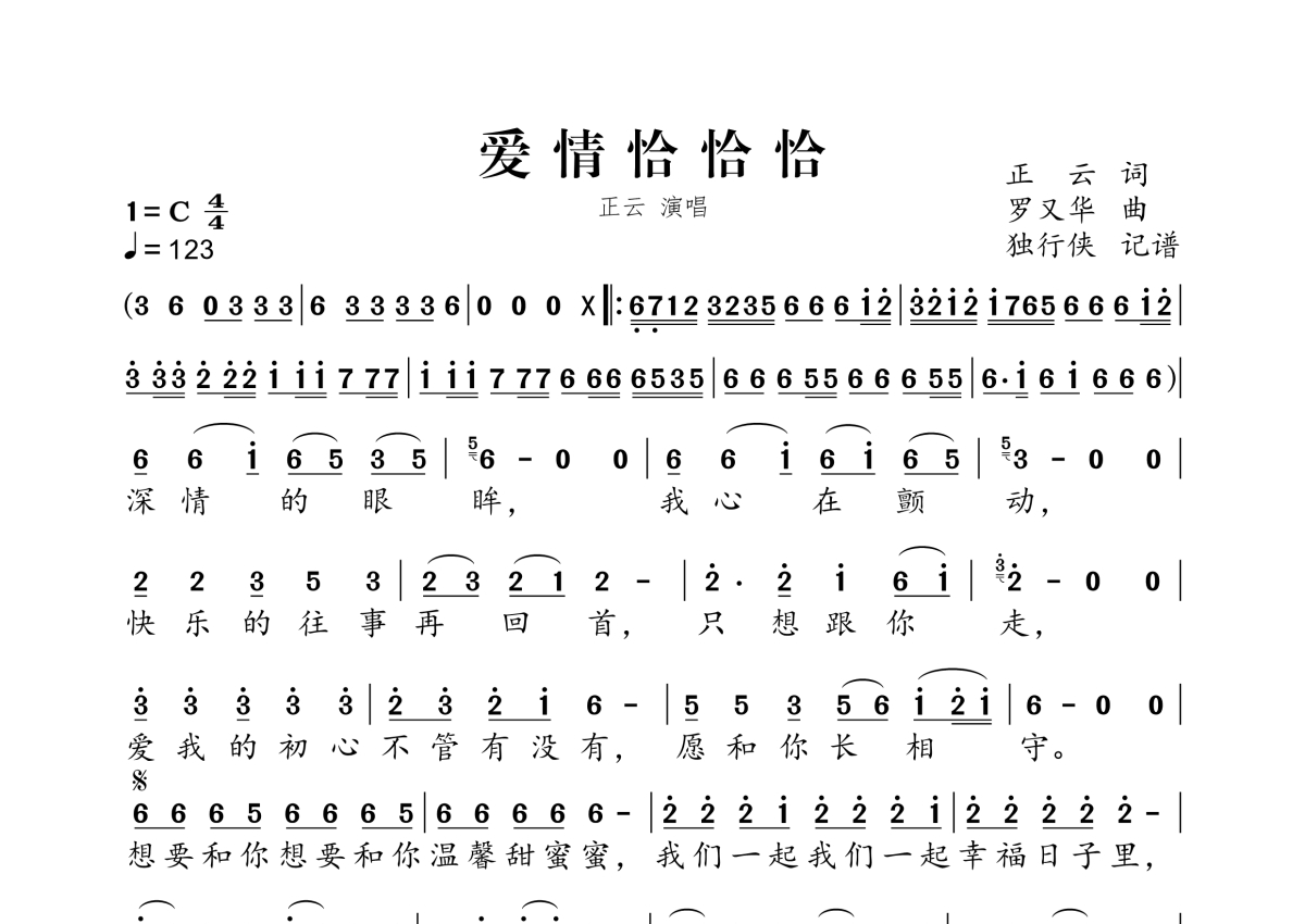 《爱情恰恰恰》是正云演唱的一首歌曲,拍号为4/4拍,歌曲速度为每分钟123拍,这份简谱共有一张高清图谱,图谱由 @独行侠 编配上传。