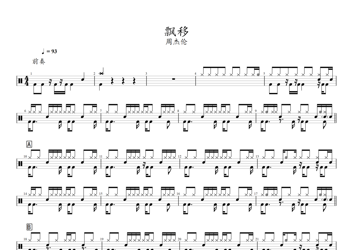 《飘移》是周杰伦演唱的一首歌曲,拍号为4/4拍,歌曲速度为每分钟93拍,这份架子鼓谱共有两张高清图谱,图谱由 @音符喷血者 编配上传,图谱使用五线谱编配,使用这份飘移架子鼓谱,你将能够轻松地敲打出这首周杰伦的飘移,快来尝试吧。