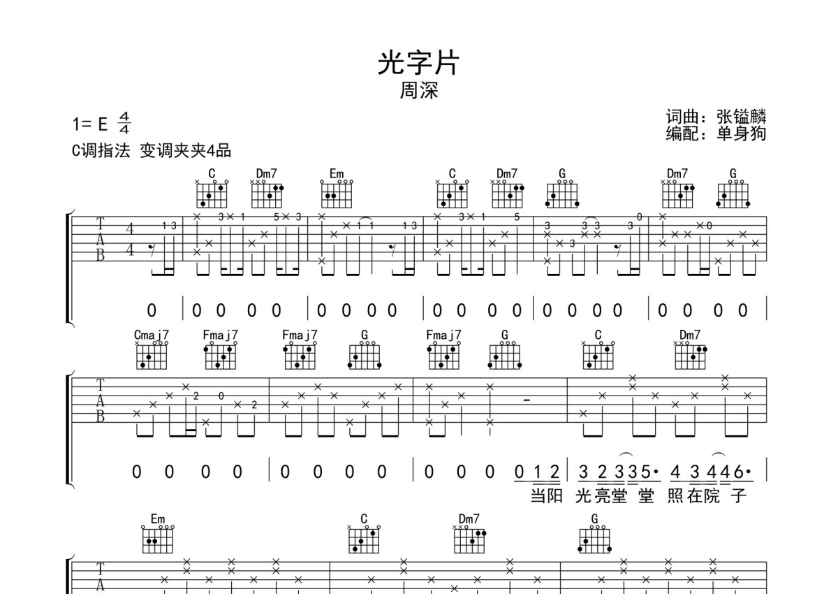 《光字片》是周深演唱的一首歌曲,本吉他谱采用的是C调指法编配,这份吉他谱共有三张高清图谱,图谱由 @单身狗 编配上传,图谱使用六线谱编配,包含吉他和弦指法、简谱以及歌词部分,使用这份光字片吉他谱,可以让你更加方便地掌握这首歌曲的弹唱技巧,快来尝试吧。周深《光字片》吉他弹唱谱,采用C调指法编配,单身狗编配出品,共有3张高清图谱。