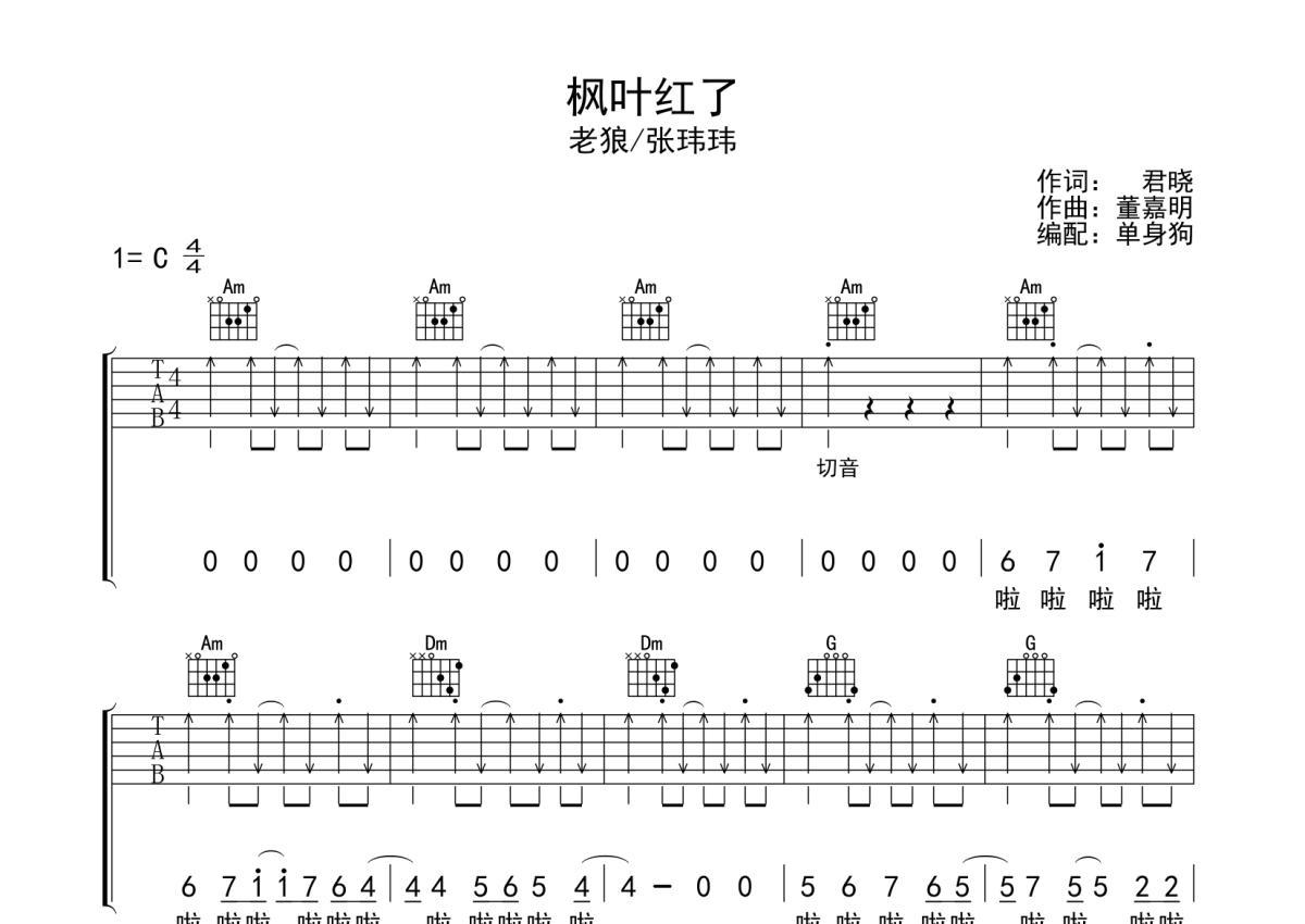 老狼/张玮玮《枫叶红了》吉他谱 - C调弹唱六线谱
