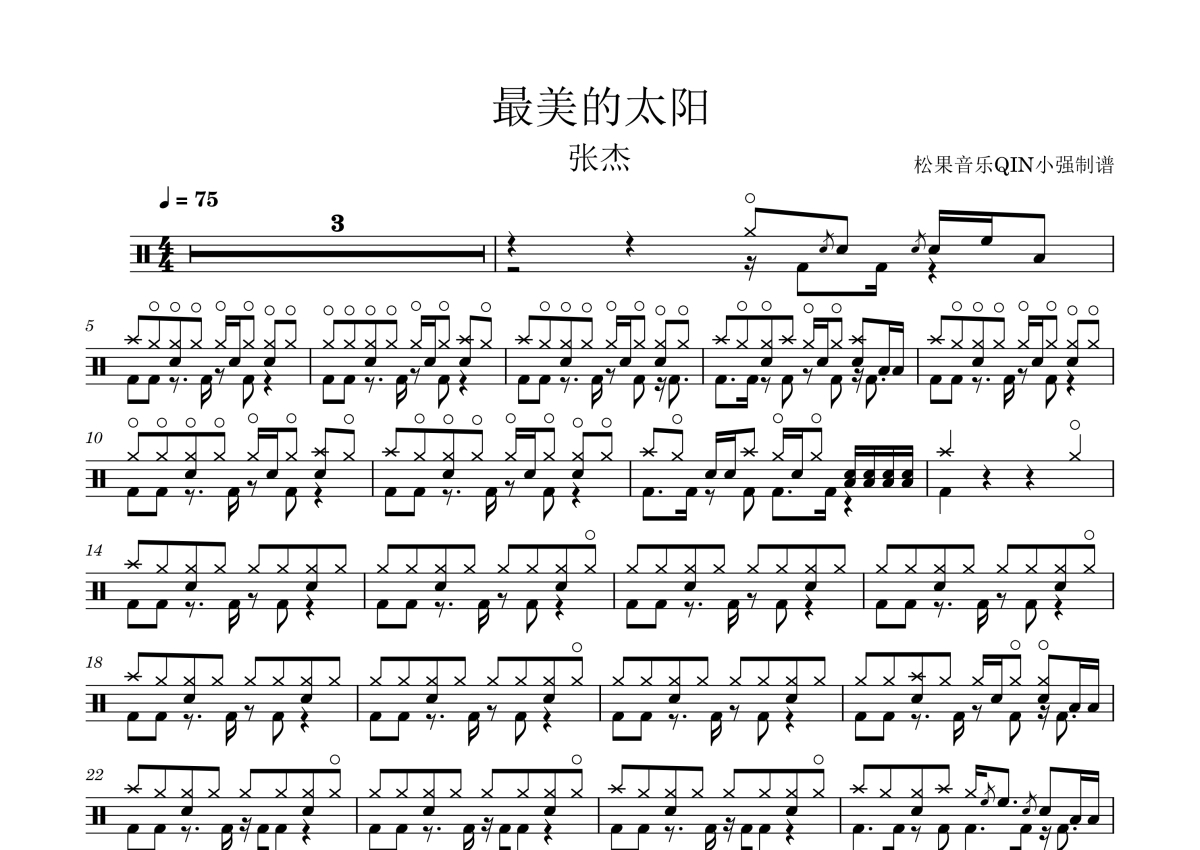 《最美的太阳》是张杰演唱的一首歌曲,拍号为4/4拍,这份架子鼓谱共有两张高清图谱,图谱由 @松果音乐QIN小强 编配上传,图谱使用五线谱编配,使用这份最美的太阳架子鼓谱,你将能够轻松地敲打出这首张杰的最美的太阳,快来尝试吧。《最美的太阳》 是张杰演唱的一首歌曲,由刘吉宁作词作曲、周治平编曲,收录在张杰2007年发行的《最美的太阳》同名EP和2012年发行的《One Chance新歌+精选》专辑里。2007年12月4日中歌榜首播。