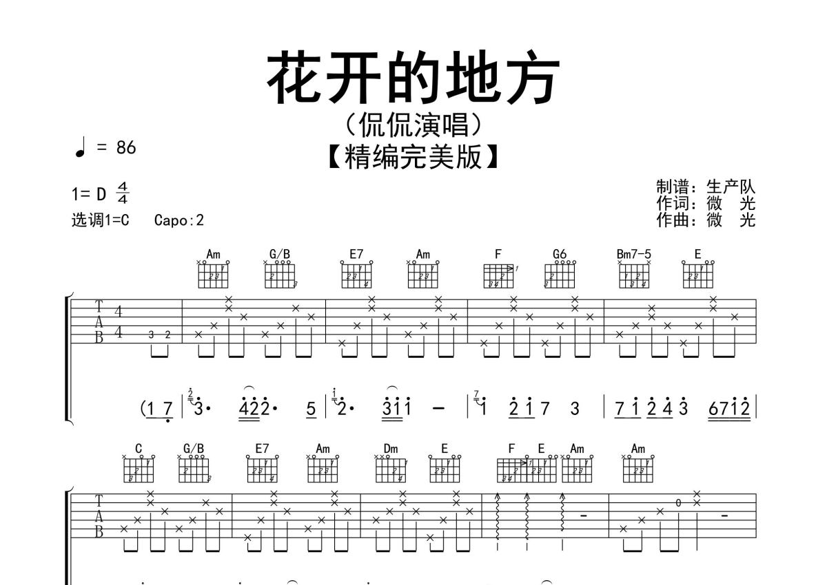 《花开的地方》是侃侃演唱的一首歌曲,精编完美版,拍号为4/4拍,歌曲速度为每分钟86拍,歌曲原调为D调,但由于原调指法比较难,为了方便弹奏,本吉他谱采用的是C调指法编配,变调夹2品弹奏即为原调,当然也可以根据自己的音域改变变调夹位置,或者通过改变和弦调性,以方便自己弹奏,这份吉他谱共有三张高清图谱,图谱由 @生产队 编配上传,图谱使用六线谱编配,包含吉他和弦指法、简谱以及歌词部分,使用这份花开的地方吉他谱,可以让你更加方便地掌握这首歌曲的弹唱技巧,快来尝试吧。侃侃演唱的歌曲《花开的地方》原版吉他谱,完整的前奏、间奏solo编配,精编完美版,值得推荐!。