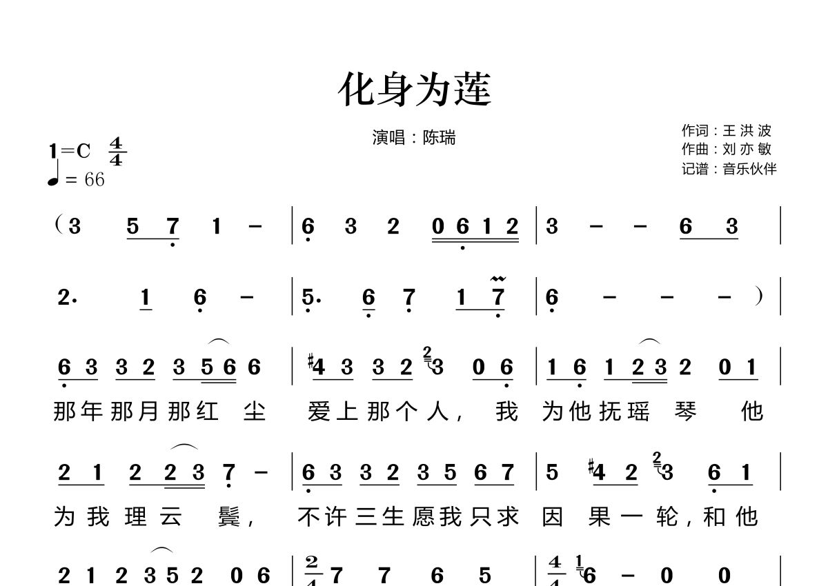 《化身为莲》是陈瑞演唱的一首歌曲,拍号为4/4拍,歌曲速度为每分钟66拍,这份简谱共有两张高清图谱,图谱由 @音乐伙伴 编配上传。