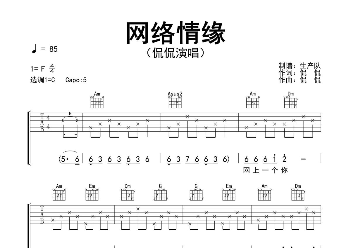 《网络情缘》是侃侃演唱的一首歌曲,精编完美版,拍号为4/4拍,歌曲速度为每分钟85拍,歌曲原调为F调,但由于原调指法比较难,为了方便弹奏,本吉他谱采用的是C调指法编配,变调夹5品弹奏即为原调,当然也可以根据自己的音域改变变调夹位置,或者通过改变和弦调性,以方便自己弹奏,这份吉他谱共有三张高清图谱,图谱由 @生产队 编配上传,图谱使用六线谱编配,包含吉他和弦指法、简谱以及歌词部分,使用这份网络情缘吉他谱,可以让你更加方便地掌握这首歌曲的弹唱技巧,快来尝试吧。侃侃演唱的歌曲《网络情缘》原版吉他谱,精准的前奏、间奏solo编配,精编完美版,怀旧经典!。