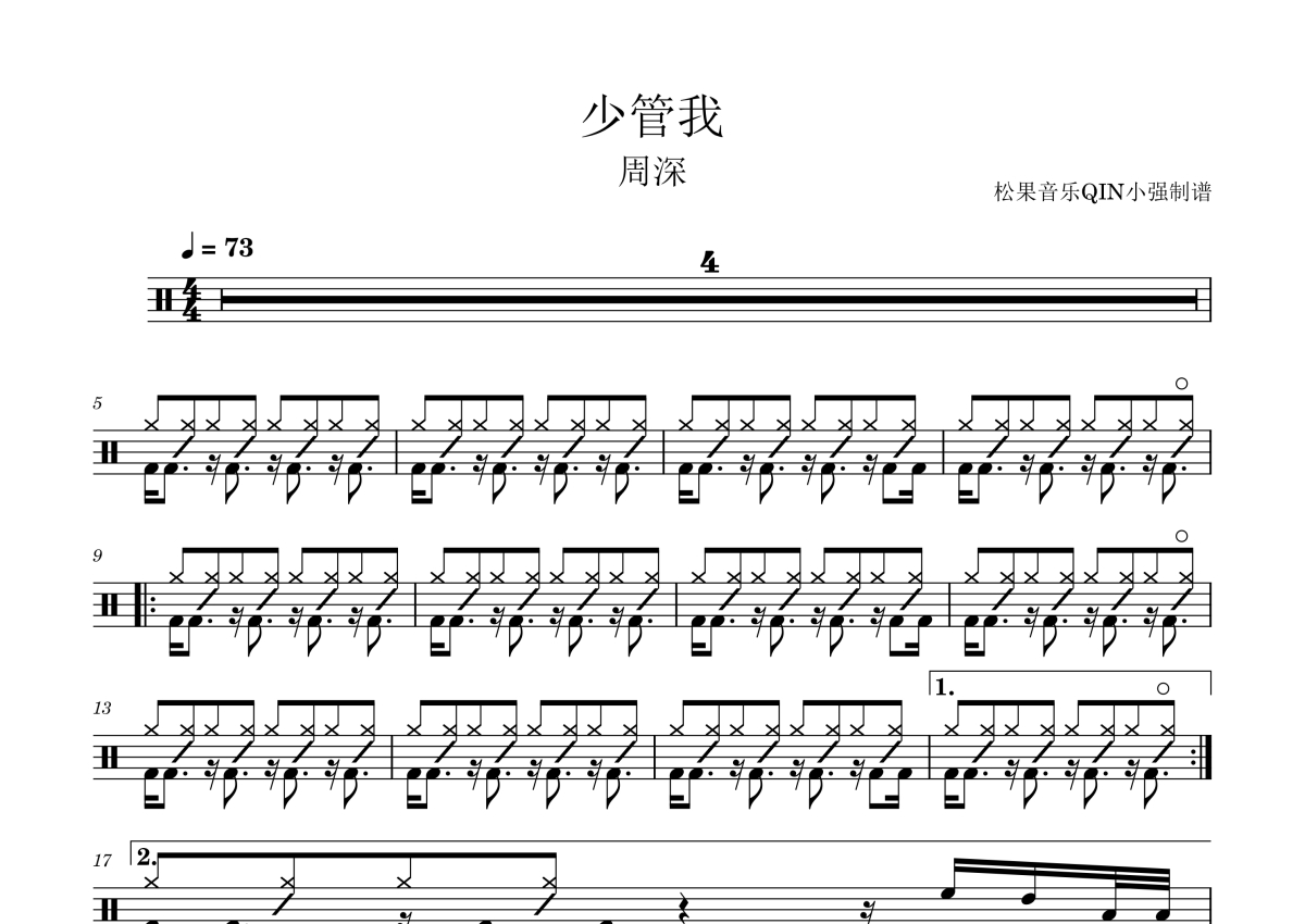 《少管我》是周深演唱的一首歌曲,拍号为4/4拍,这份架子鼓谱共有两张高清图谱,图谱由 @松果音乐QIN小强 编配上传,图谱使用五线谱编配,使用这份少管我架子鼓谱,你将能够轻松地敲打出这首周深的少管我,快来尝试吧。《少管我》是周深演唱,吕易秋、周深填词,钱雷、周深作曲的歌曲,收录于周深的个人专辑《反深代词》中,2024年5月14日推出试听版,正式发行于2024年5月19日。