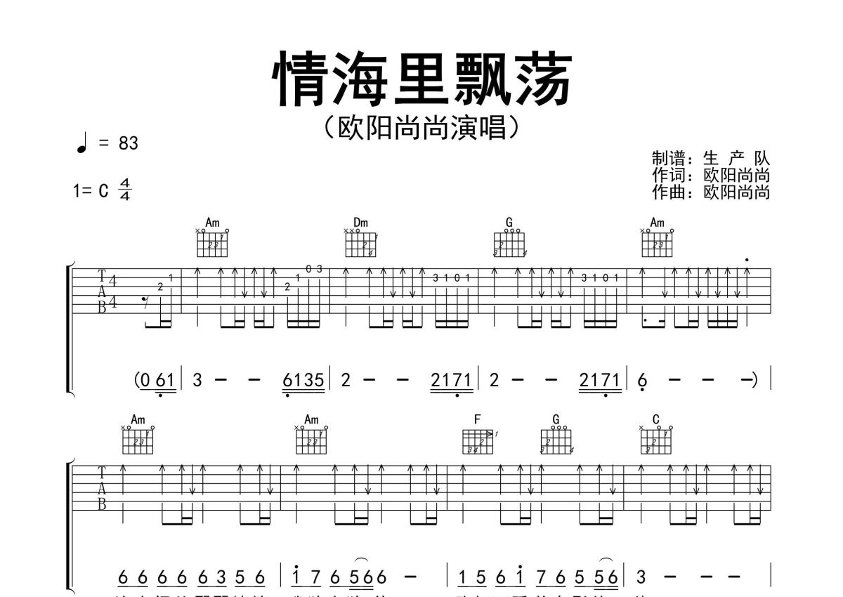 《情海里飘荡》是欧阳尚尚演唱的一首歌曲,精编完美版,拍号为4/4拍,歌曲速度为每分钟83拍,歌曲原调为C调,本吉他谱采用的是C调指法编配,演奏时不需要使用变调夹即为原调,这份吉他谱共有三张高清图谱,图谱由 @生产队 编配上传,图谱使用六线谱编配,包含吉他和弦指法、简谱以及歌词部分,使用这份情海里飘荡吉他谱,可以让你更加方便地掌握这首歌曲的弹唱技巧,快来尝试吧。欧阳尚尚演唱的歌曲《情海里飘荡》原版吉他谱,精准的前奏、间奏solo编配,精编完美版,值得推荐!。